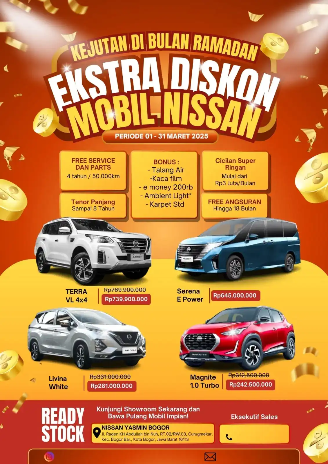 Dealer Nissan Yasmin siap melayani pembelian mobil baru dengan brand terbaik dari Jepang. Kami mengutamakan layanan 3S (Sales, Service, dan Sparepart) untuk memberikan kenyamanan dan kepuasan terbaik. Nikmati kemudahan pembelian melalui sistem offline maupun online yang fleksibel dan terpercaya.